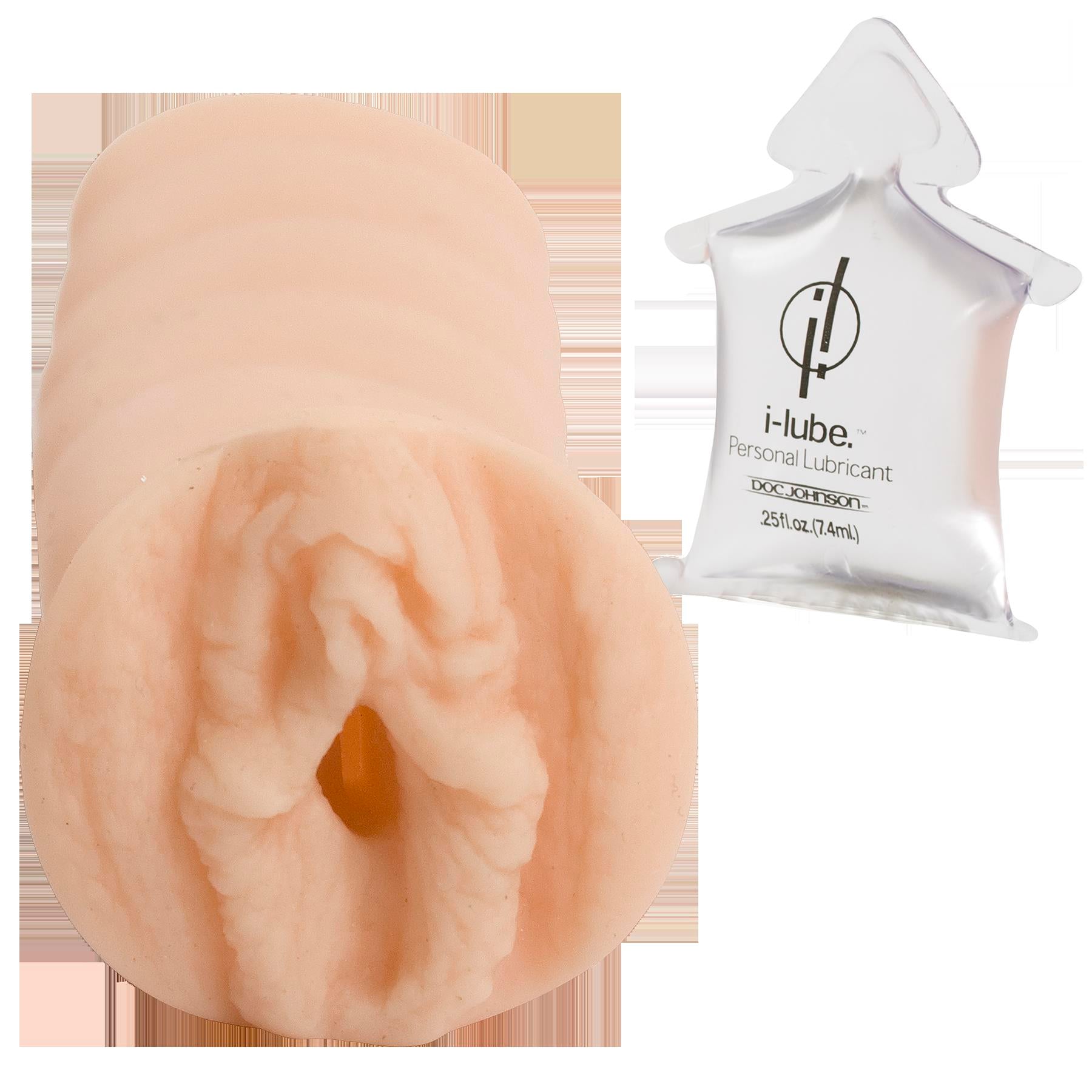 Masturbator that comes in a tube and in the shape of a vagina with an attached sleeve. Made out of UR3 material and is in the color of white flesh.