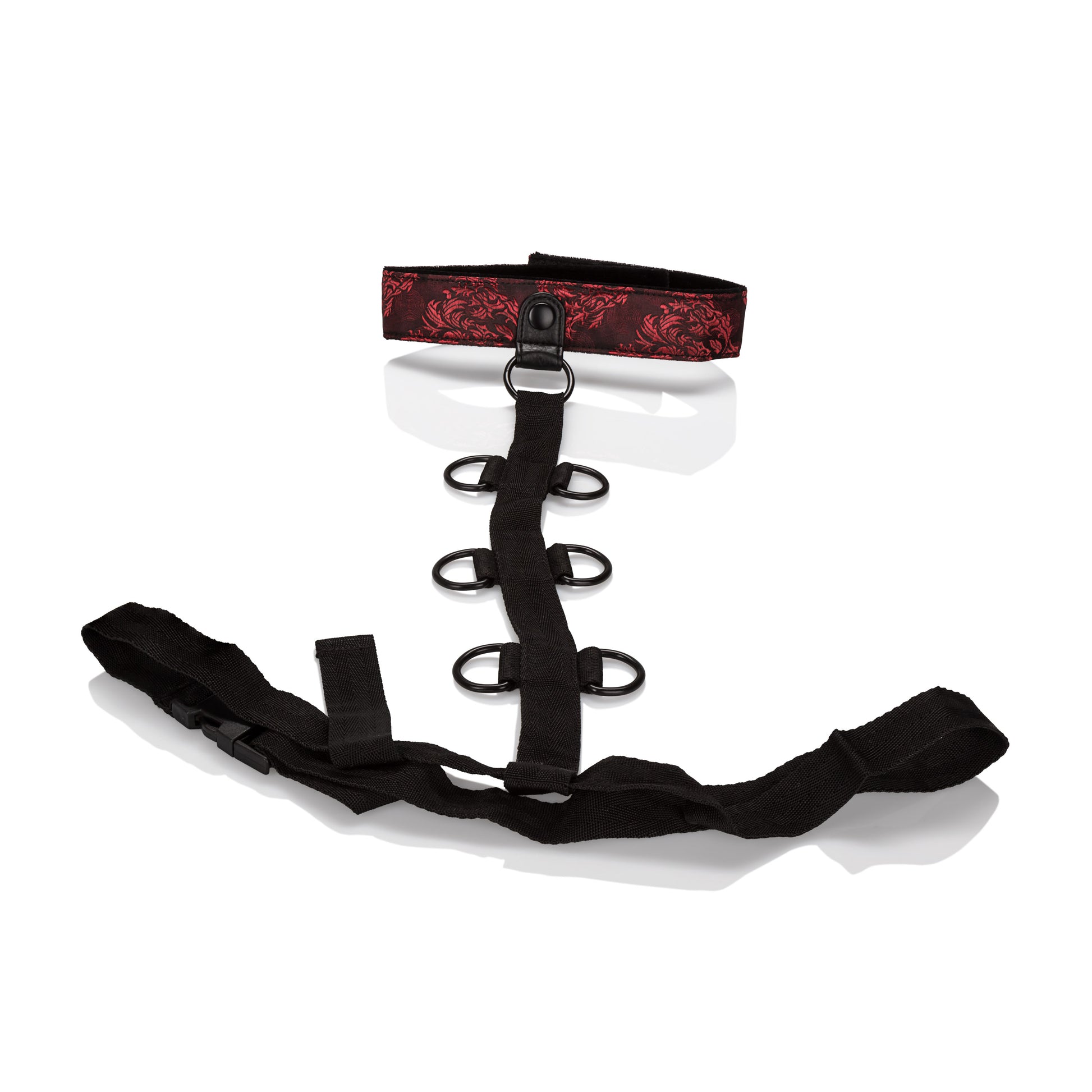 Luxurious collar with universal cuffs and adjustable restraints. Collar adjusts up to 20"/50.75cm. Waist straps adjust up to 46"/116.75cm. Reversible design to wear in front or back. Soft and plushy on one side, with designer fabric on the other. Detachable cuffs for independent use. Universal clasps and D rings with swivel design. Non-tarnishing, nickel free. Polyester (fabric, lining, velcro) PP (straps, buckles) Nickel free alloy (clasps) Nickel free iron (D rings)